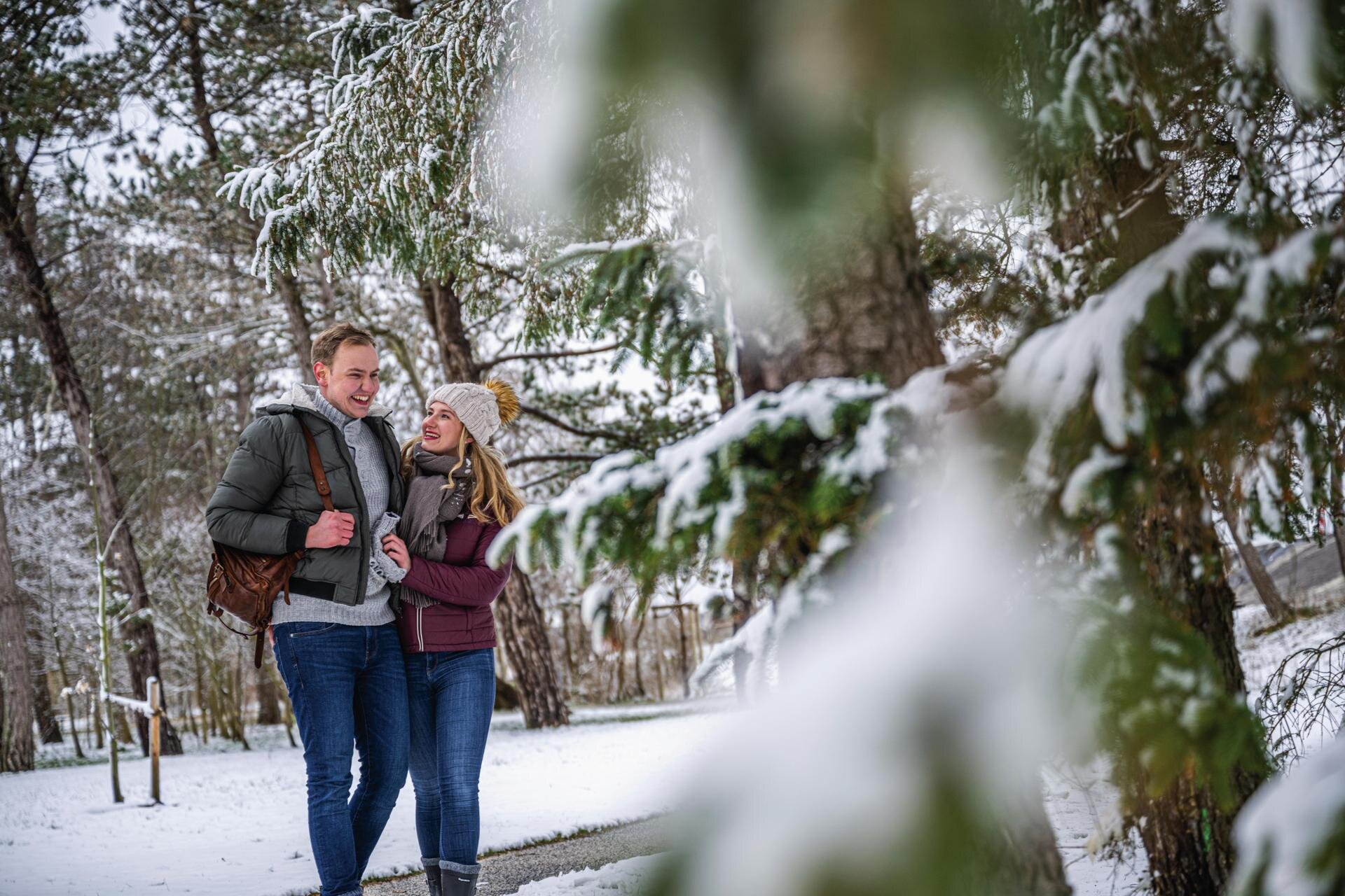 Pärchen im Schnee bedeckten Wald